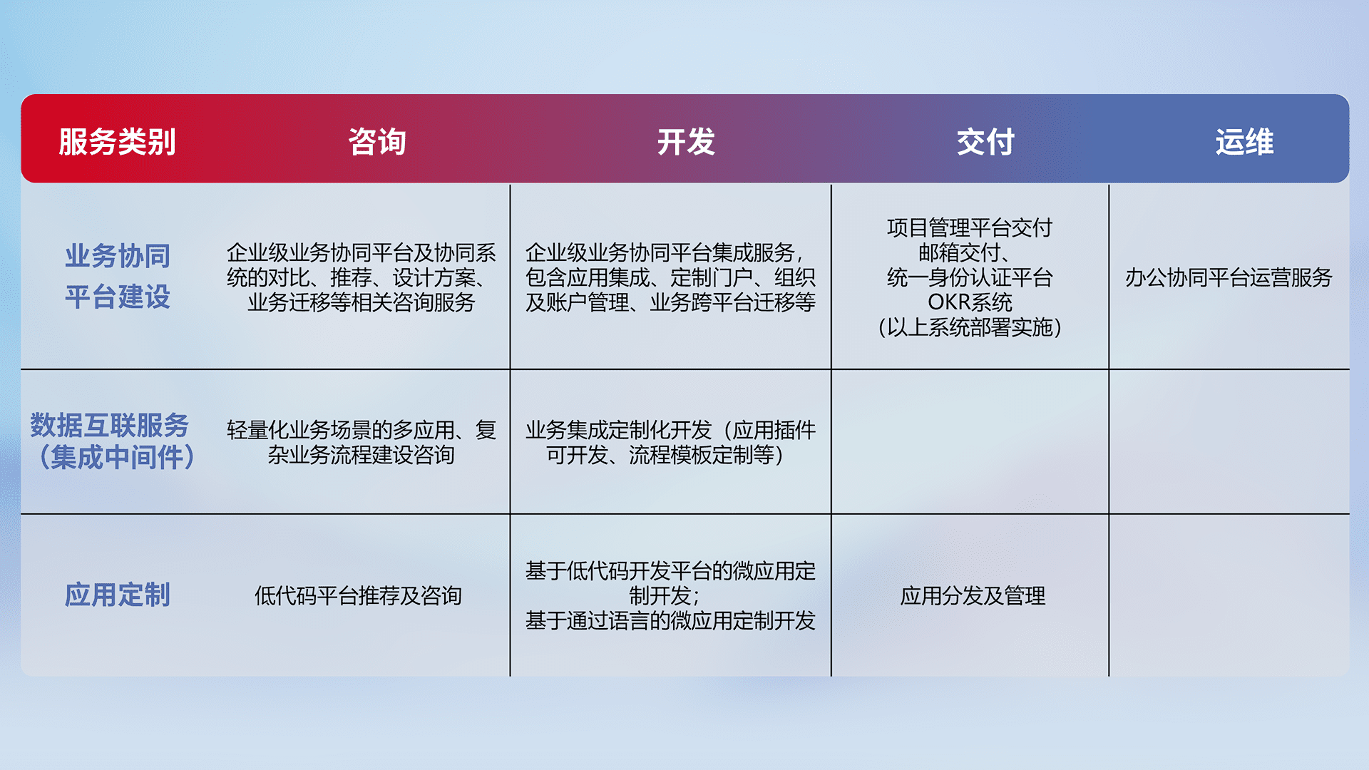 针对钉钉、、、企微、、、、IDaas等平台级产品提供产品的规划、、、、方案、、交付、、、、定制化开发等服务,,,实现如统一协同办公、、智能客户服务、、混合会议管理、、、、智能数据查询、、、、等业务场景,,,实现数字化转型。。。