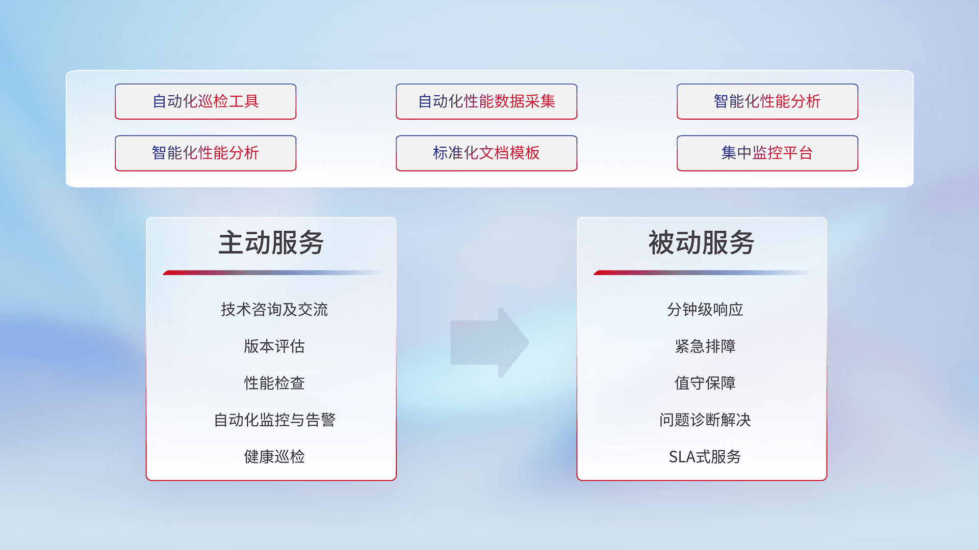 智能化工具和标准化文档,,,,保障服务质量,,提供主动服务(包含技术咨询、、、、版本评估、、、、性能检查、、自动化监控与告警、、、健康巡检)和被动服务包含(分钟级响应、、紧急排障、、值守保障、、、问题诊断解决、、、、SLA服务)。。。